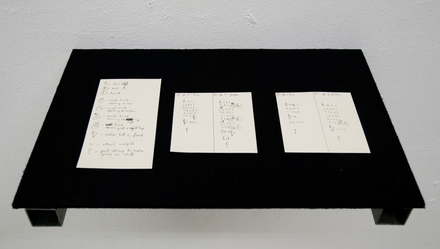 The second part of the performance consist out of a performer who diligently tries to comprehend and execute a list of written instructions with the use of a steel apparatus. The long list of numbers and symbols result in an array of compositions with colored chalk lines trough out the space. Every composition is being registered on a chalk cylinder placed on top of the steel apparatus. The complexity of the instructions and their attainability, demands a high level of improvisation, audience participation and ad hoc problem solving.